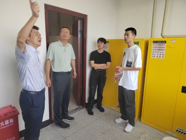 吕延文一行先后走访检查危化品暂存间、基础化学实训室、危化工艺实训室、博士科研工作室等教学科研场所。检查过程中,吕校长详细了解了实训室的建设使用情况,仔细查看了实训室的环境卫生、设备运行与维护、消防设施配备、用电安全规范、化学品管理与使用、危险废弃物处置以及安全通道畅通等情况。他详细询问了各实训室安全管理责任制的落实情况、日常安全检查记录、应急预案制定与演练成效,并就部分大型精密仪器设备的操作规程、维护保养记录进行了重点抽查。