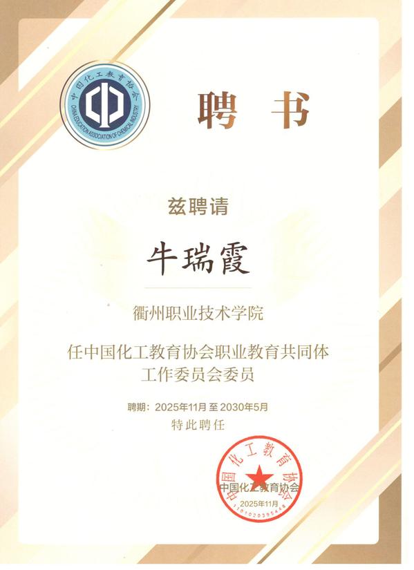 此外,牛瑞霞教授还被聘任为中国化工教育协会职业教育共同体工作委员会委员,这不仅是对其个人专业能力的认可,也标志着我院在化工职业教育领域的话语权和影响力进一步提升。