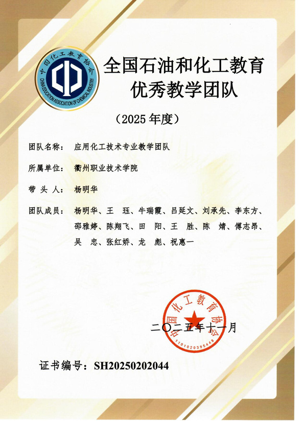 近日,中国化工教育协会正式公布了2025年全国石油和化工教育青年教学名师、优秀教学团队、优秀教学管理人员评审结果。我院由杨明华教授领衔的“应用化工技术专业教学团队”荣获“全国石油和化工教育优秀教学团队”称号,牛瑞霞教授荣获“全国石油和化工教育优秀教学管理人员”称号。
